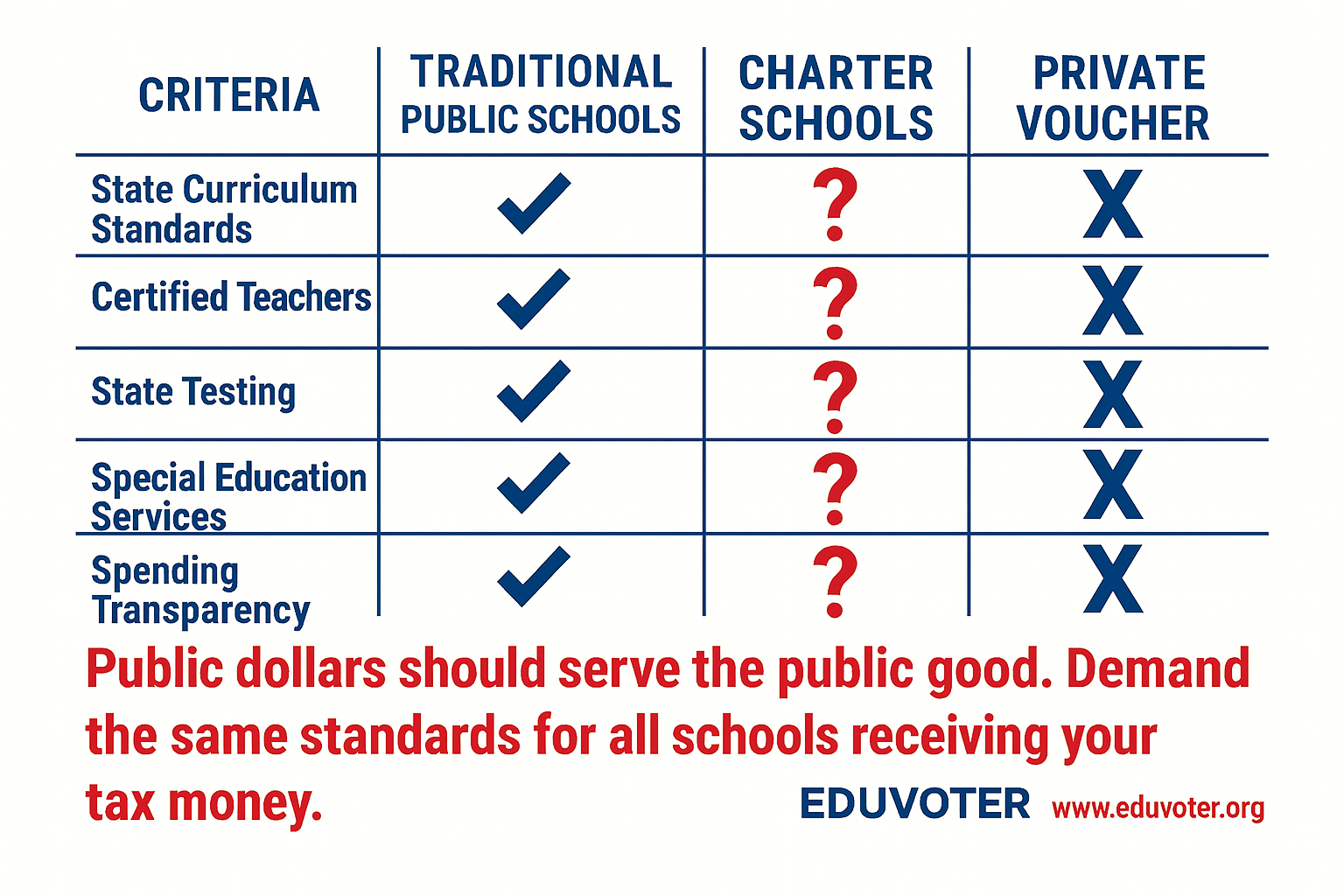 At EDUVOTER, we believe every child—regardless of zip code, background, or ability—deserves access to a fully funded, high-quality traditional public education that prepares them for success in life. Traditional public schools are the cornerstone of our democracy and the heart of our communities, yet taxpayer dollars are increasingly being diverted to private institutions with limited transparency or accountability. We are committed to addressing policies that weaken these community schools, restrict what can be taught, and limit educators’ ability to serve their students. By providing parents and communities with clear, factual information—not slogans—we empower them to make informed choices and work together to strengthen the traditional public schools that our children and neighborhoods depend on.